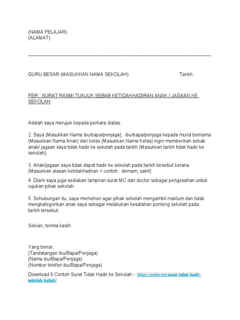 Contoh Surat Rasmi Tidak Hadir Ke Sekolah Pdf